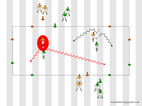 Die Passgeber eilt hinterher und versucht den Ball zu erobern und nun seinerseits zu kontern. Das Spielrunde endet, wenn der Ball im Aus oder erfolgreich durch ein Dribbling abgeschlossen wird.